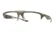 A armação retangular em titânio na cor peltre apresenta acabamento polido e estrutura sem aro inferior (aro aberto), criando um visual minimalista e leve. As plaquetas ajustáveis proporcionam encaixe confortável e personalizado, ideal para uso prolongado.