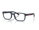 A armação em material injetado na cor azul fosco apresenta estrutura resistente e confortável, com ajuste para ponte alta e aro fechado. As hastes em náilon contam com inserções de borracha nas pontas para maior estabilidade no uso diário, além da icônica faixa vermelha Linea Rossa, assinatura marcante da coleção.